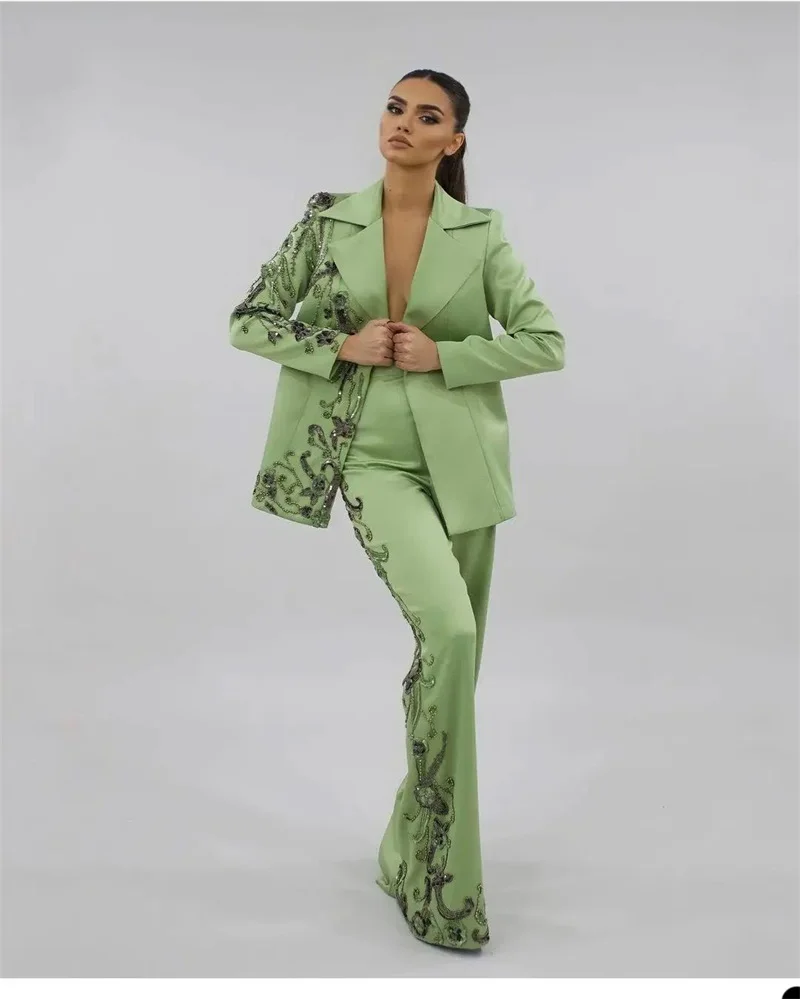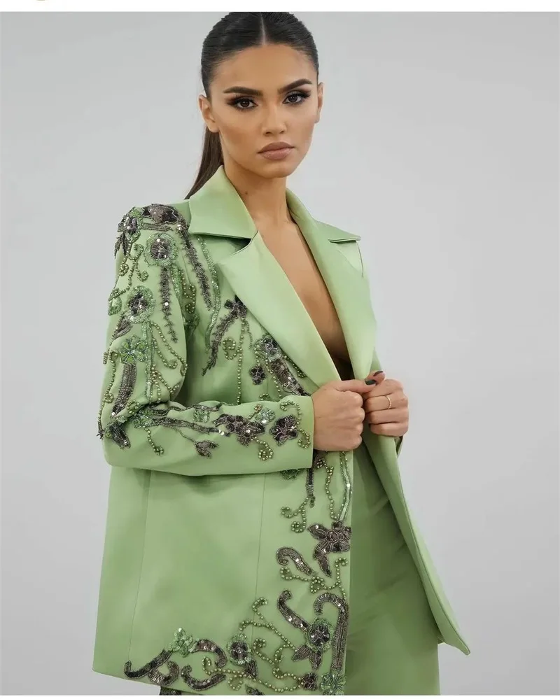 Designer Green Satin Women Suits Set Luxury Bead Applique Formal Wedding Evening Prom Dress 2 Pieces Blazer+Pants Customized