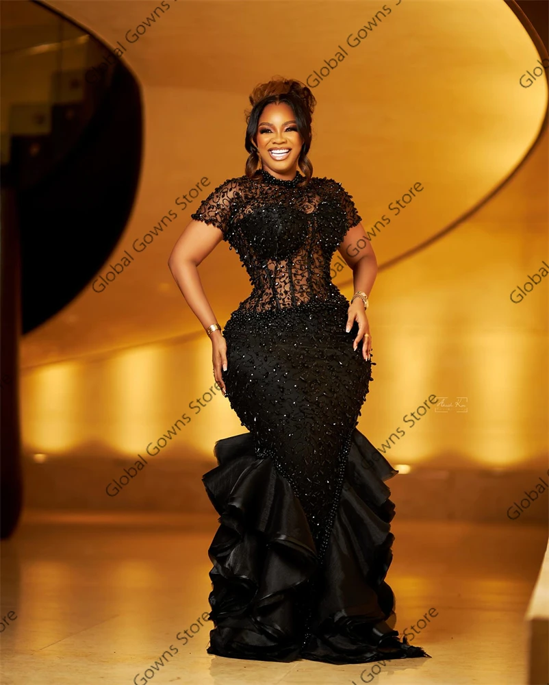 Sparkly Black Ruffles Evening Dresses Bead Crystal Birthday Luxury Dress O Neck Mermaid Party Gown